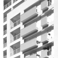 Dal punto di vista compositivo il prospetto angolare può essere considerato una sintesi della costruzione: in esso si ritrovano i principi di rotazione, di aggetto e anche il telaio aggrappato sulla facciata, nella parte residenziale.